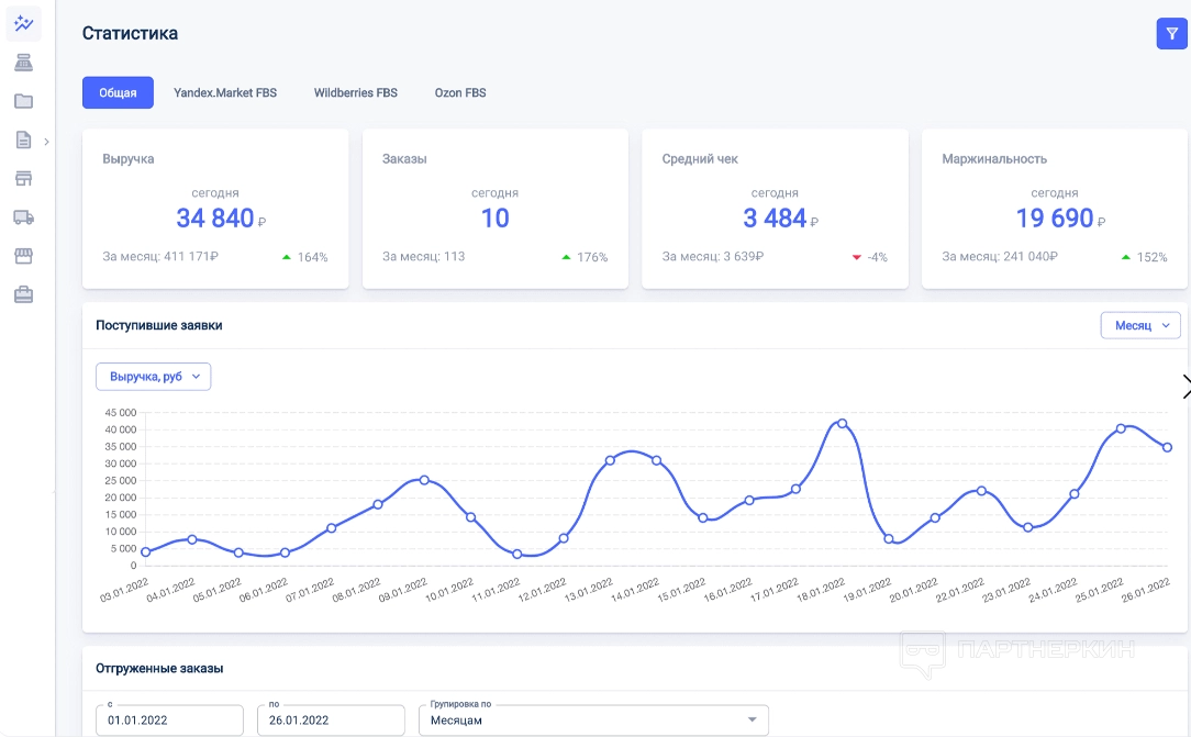 Пользователь может смотреть общую статистику или в разрезе каждого маркетплейса, анализировать долю каждого канала и его эффективность за разные периоды времени, следить за оборотом и маржинальностью по поступившим и выкупленным заказам.