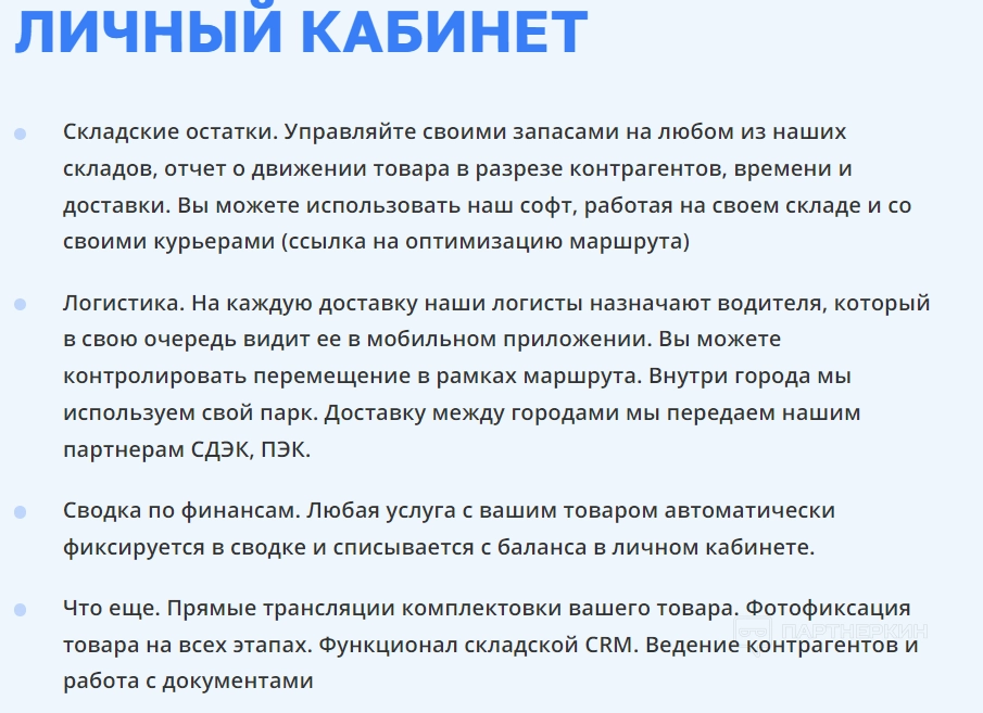 По сравнению со своими конкурентами, проекта не сильно выделяется в ценовом плане — доставка оптимизирована, работа склада чуть завышена по стоимости, как и маркировка. Но есть комплексные решения, актуальные для новых участников сотрудничества. Интересно, что в прилагаемом файле произведен также сравнительный анализ с другими фулфилмент-сервисами (Фулик, ФФпросто) и службами доставки (СДЭК).