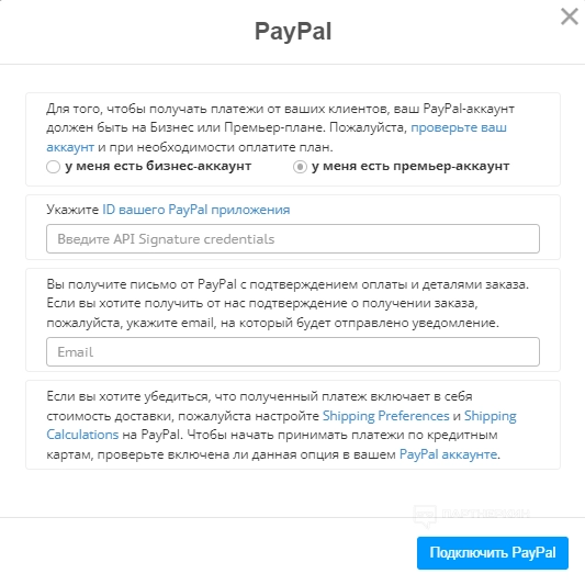Настройки платежей. Чтобы получать платежи от клиентов, PayPal-аккаунт должен быть на Бизнес или Премьер-плане.