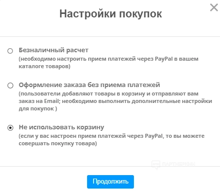 - Безналичный расчет. Необходимо настроить прием платежей через PayPal в каталоге товаров.