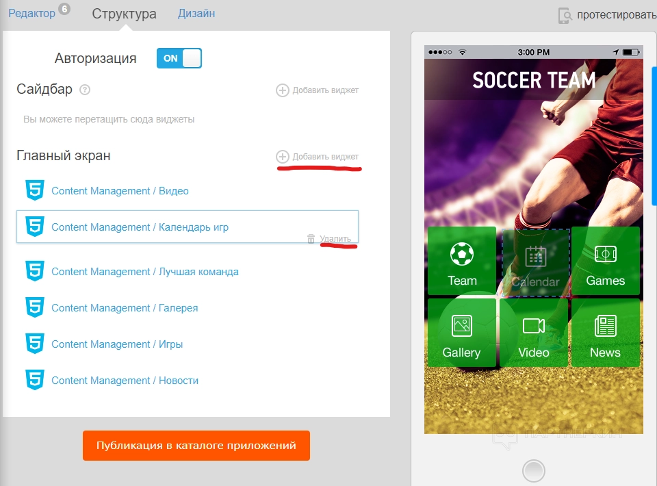 Аналогичным образом необходимо настроить другие разделы приложения. В нашем примере это — Calendar, Games, Gallery, Video, News. Когда пользователь завершит редактирование, нужно перейти в следующие разделы — «Структура» и «Дизайн».