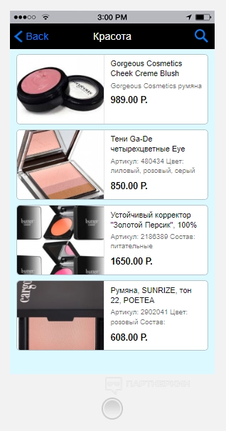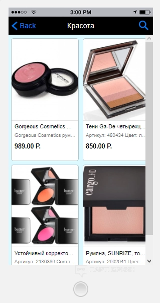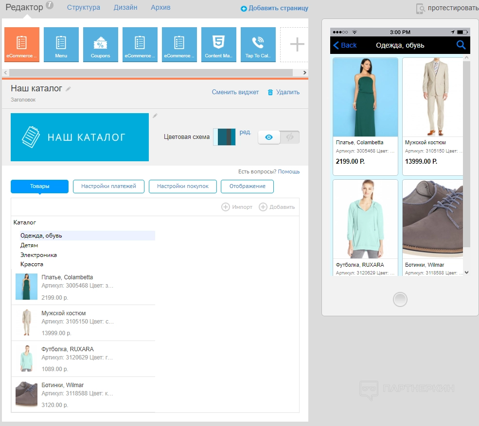 Товары. Здесь находится каталог товаров для покупателей (в нашем примере это одежда, обувь, детские игрушки, электроника, косметика).