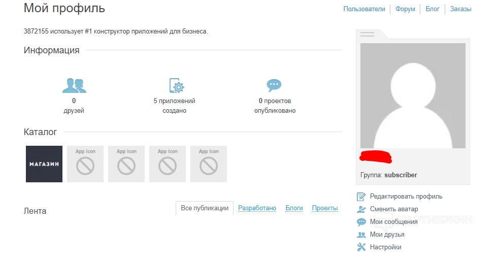 В личном кабинете отображается информация по количеству друзей, созданных приложений и опубликованных проектов. Здесь можно редактировать профиль, изменить аватар и посмотреть сообщения.