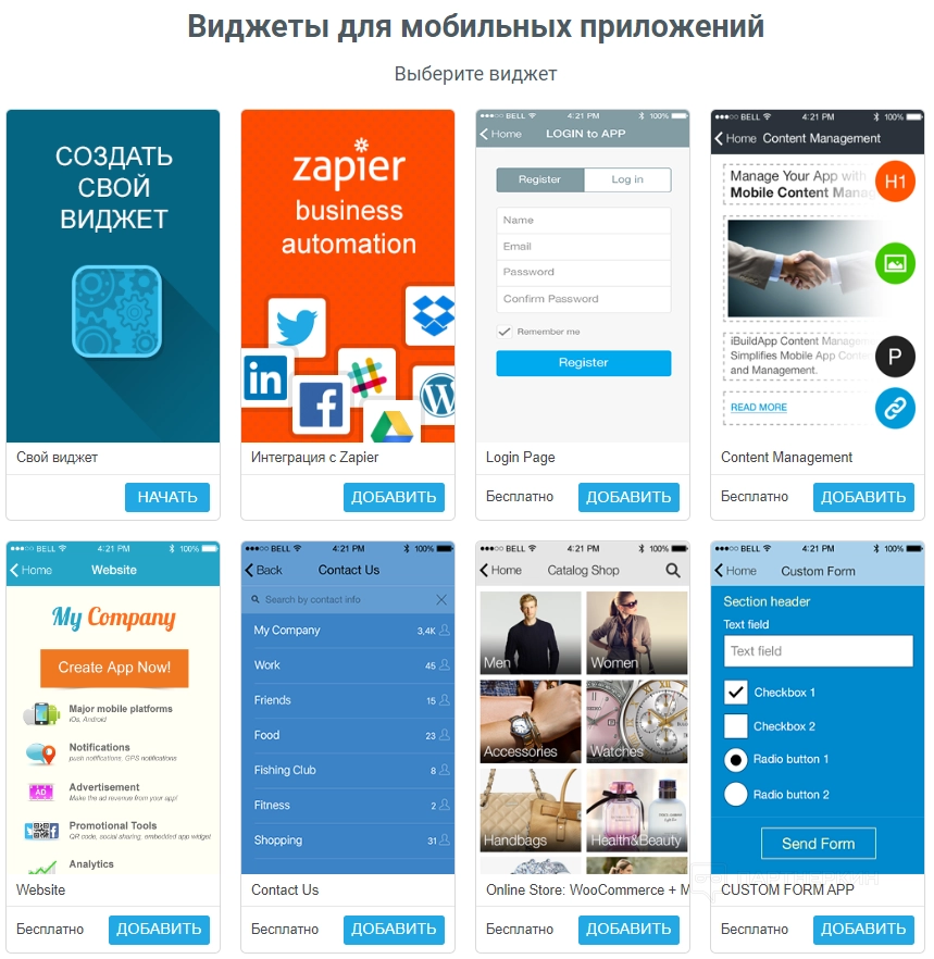 - Встроенные виджеты. Сервис iBuildApp позволяет разработчикам на iOS и Android создавать мобильные приложения с использованием 35 разных виджетов.