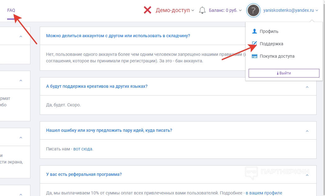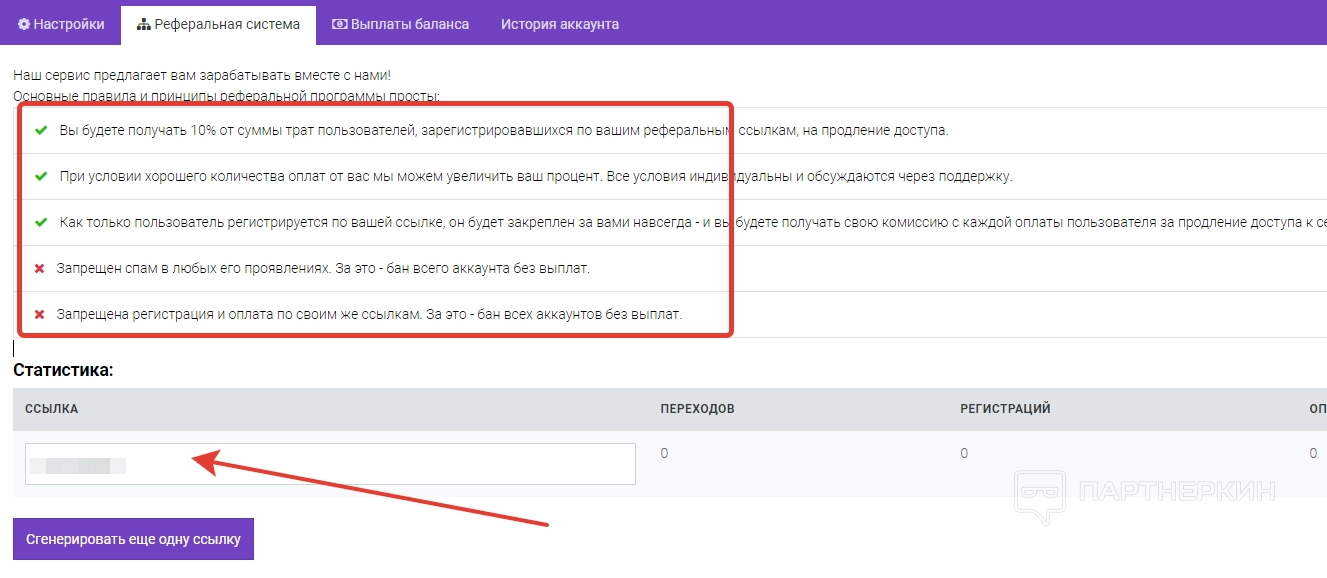 Во вкладке «Выплаты баланса» пользователь может заказывать выплаты средств, заработанных с помощью реферальной программы. В «Истории аккаунта» просматривается история посещений.