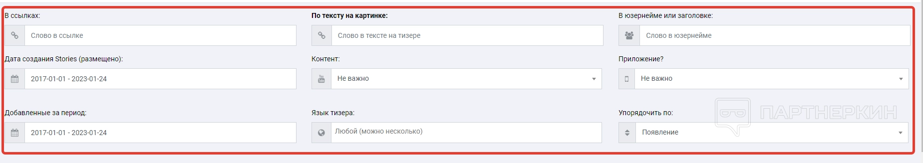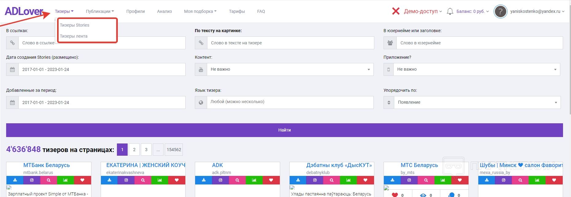 В этом разделе находится 2 вкладки: тизеры stories и тизеры ленты. В каждой из них предусмотрена гибкая система фильтрации, позволяющая подбирать необходимые материалы максимально оперативно. Разберем поиски контента на примере вкладки «Тизеры stories».