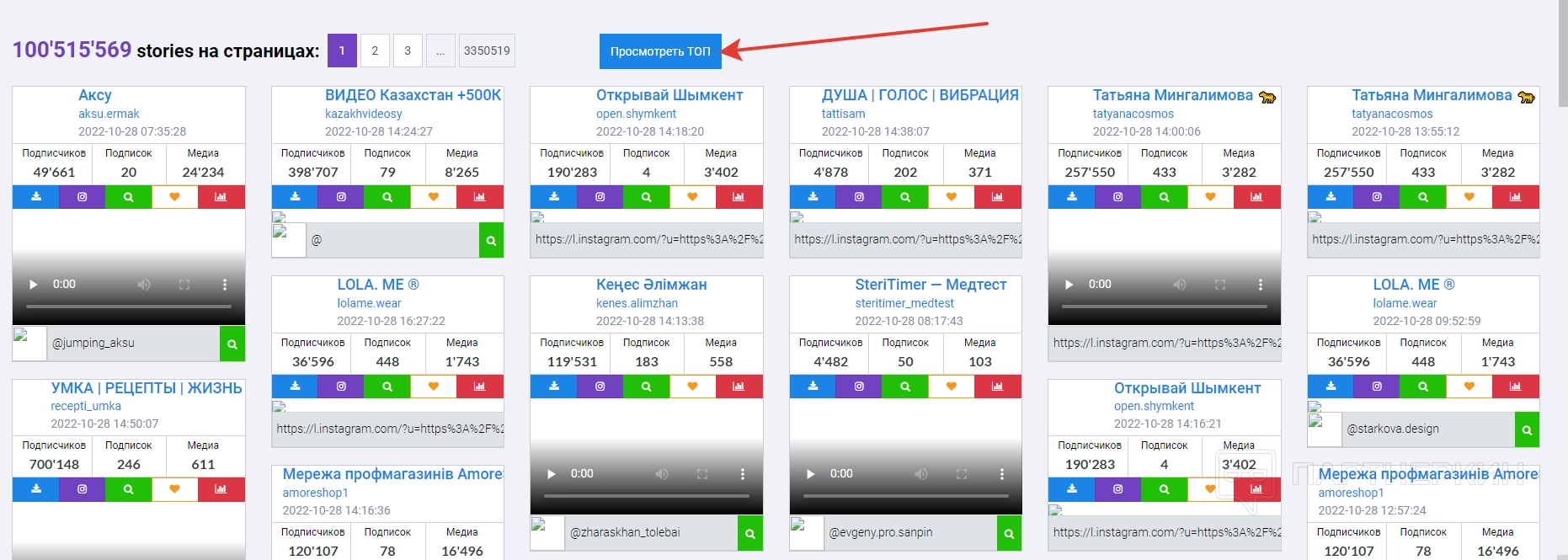 В ТОП входят профили, отсортированные по имени, количеству подписок, подписчиков, медиа и упоминаний.