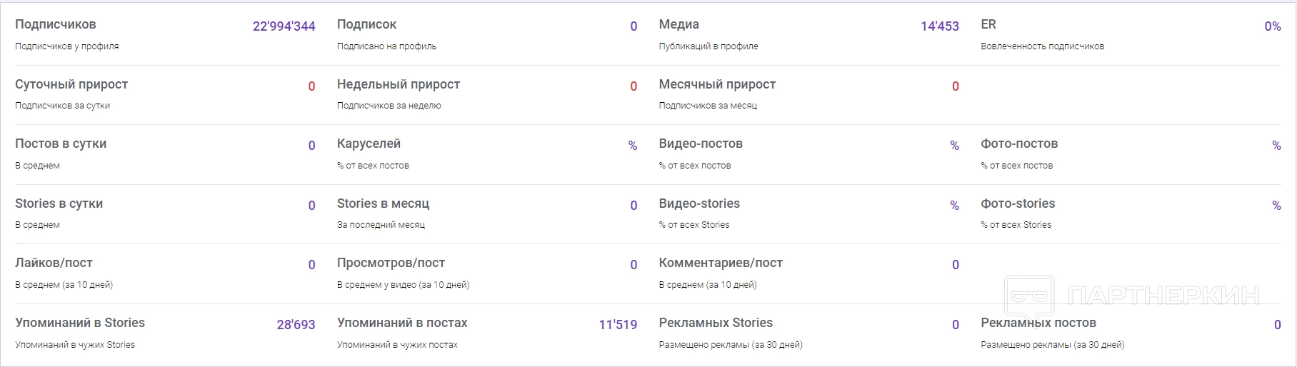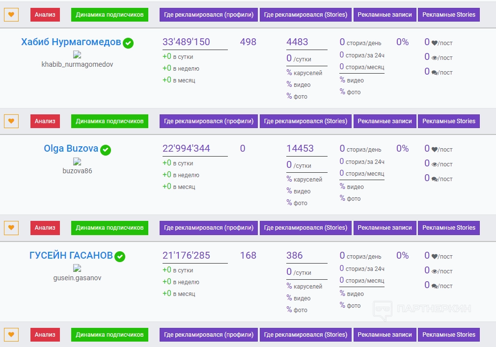 В нижней части дашборда отображается перечень популярных профилей, зарегистрированных в системе. По умолчанию система предоставляет такие данные, как количество подписчиков и подписок, число постов, рекламных записей, ER и дополнительные ссылки.