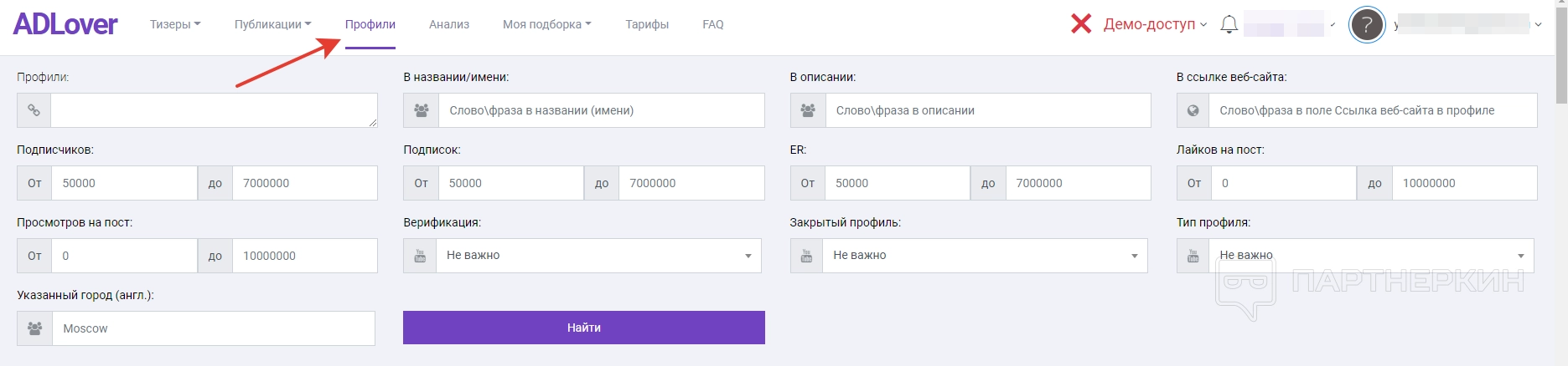 - Профили . Раздел, в котором осуществляется поиск и фильтрация аккаунтов Instagram*.