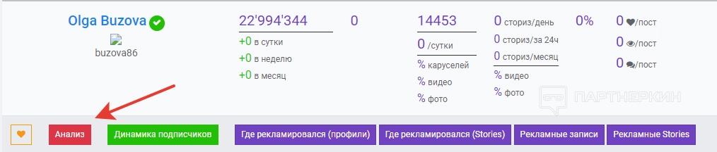 - вернутся в раздел «Профили», отыскать с помощью системы фильтрации необходимый вариант и кликнуть на кнопку «Анализ», которая находится под выбранным акк.