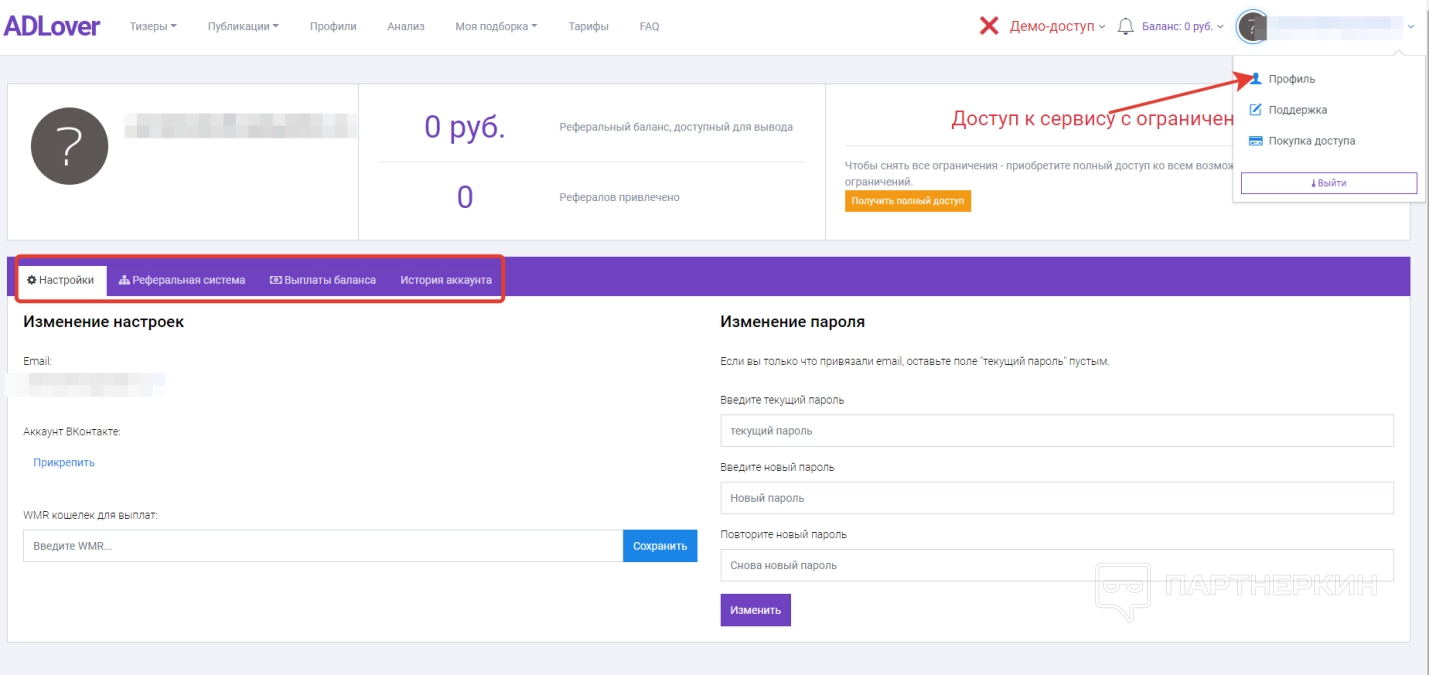 В настройках можно прикрепить аккаунт ВК и кошелек WMR. Также есть возможность изменить пароль. Что касается вкладки «Реферальная система», там расписаны условия партнерки и предоставленная партнерская ссылка.