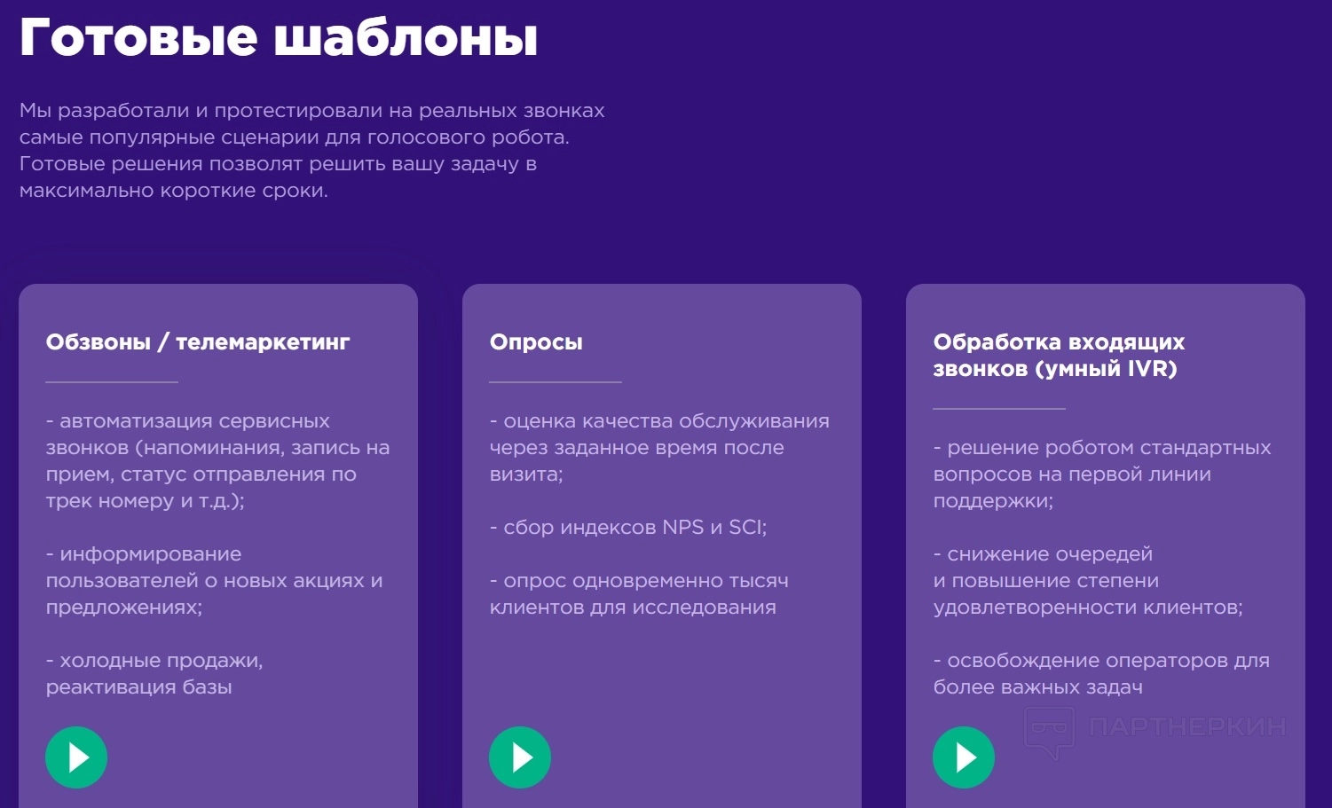 Speechrobot предлагает готовые шаблоны. Разработчики протестировали популярные сценарии на реальных звонках. Шаблоны позволяют решать бизнес-задачи в быстрые сроки. Большинство шаблонов помогают автоматизировать сервисные звонки, такие как записи на прием, напоминания, статусы отправления и другие.