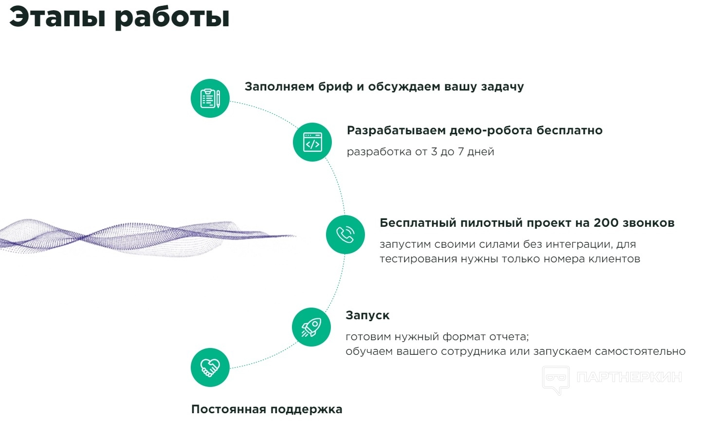 Понадобится описать задачу и желаемые бизнес-процессы. Сотрудники Speechrobot проведут аудит и анализ ответов клиентов. Следующий этап — разработка роботов, она проходит бесплатно. Необходимо оплачивать минуты работы и разговоров роботов.