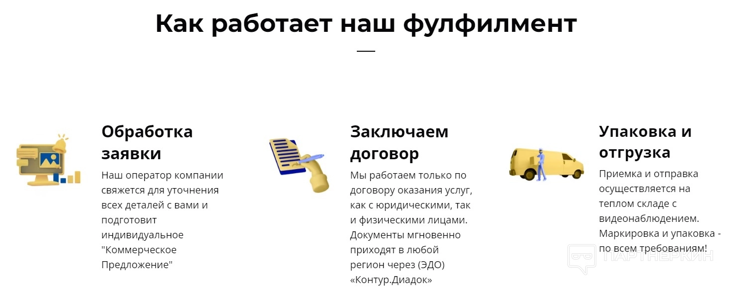 С компанией заказчик-продавец на маркетплейсах заключает договор с фиксированной оплатой без скрытых комиссий и дополнительных платежей. В договоре прописываются сроки, которые должны быть соблюдены. Fulfillment-go располагает собственный складом с обогревом и видеонаблюдением, своим автопарком грузовых автомобилей.