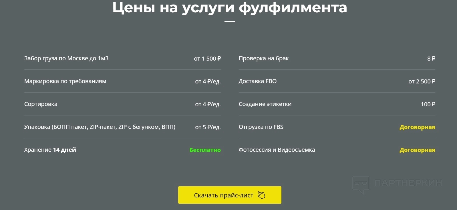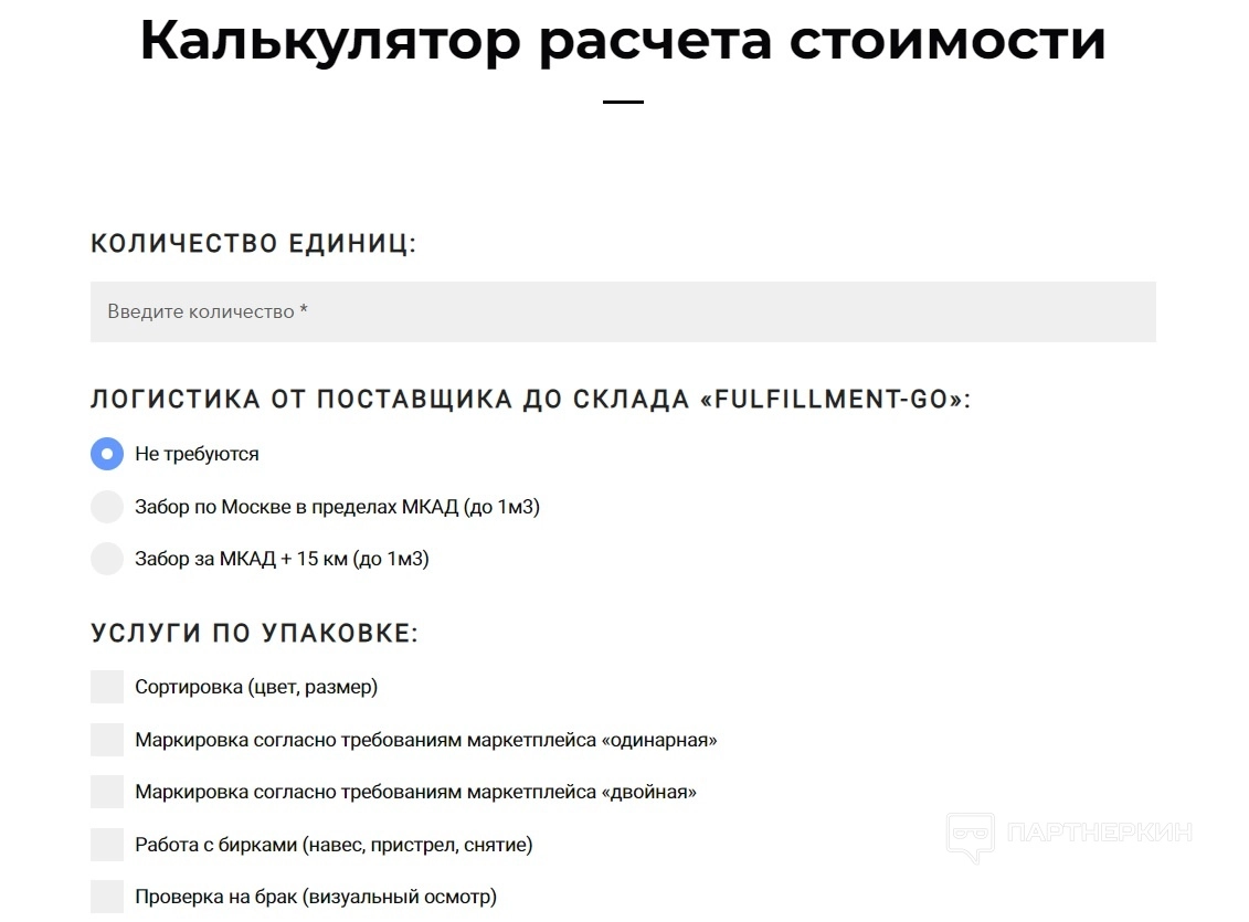 Предусмотрено несколько тарифов, которые включают приемку, пересчет, проверку на брак, маркировку. Примерный бюджет можно рассчитать на калькуляторе, размещенном на сайте компании.