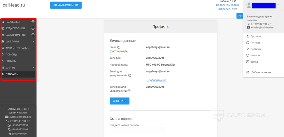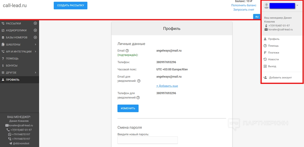 Система откроет доступ к инструментам. Меню профиля находится в верхней части экрана. Здесь можно пополнять баланс, выполнять настройки профиля и общаться со службой поддержки.