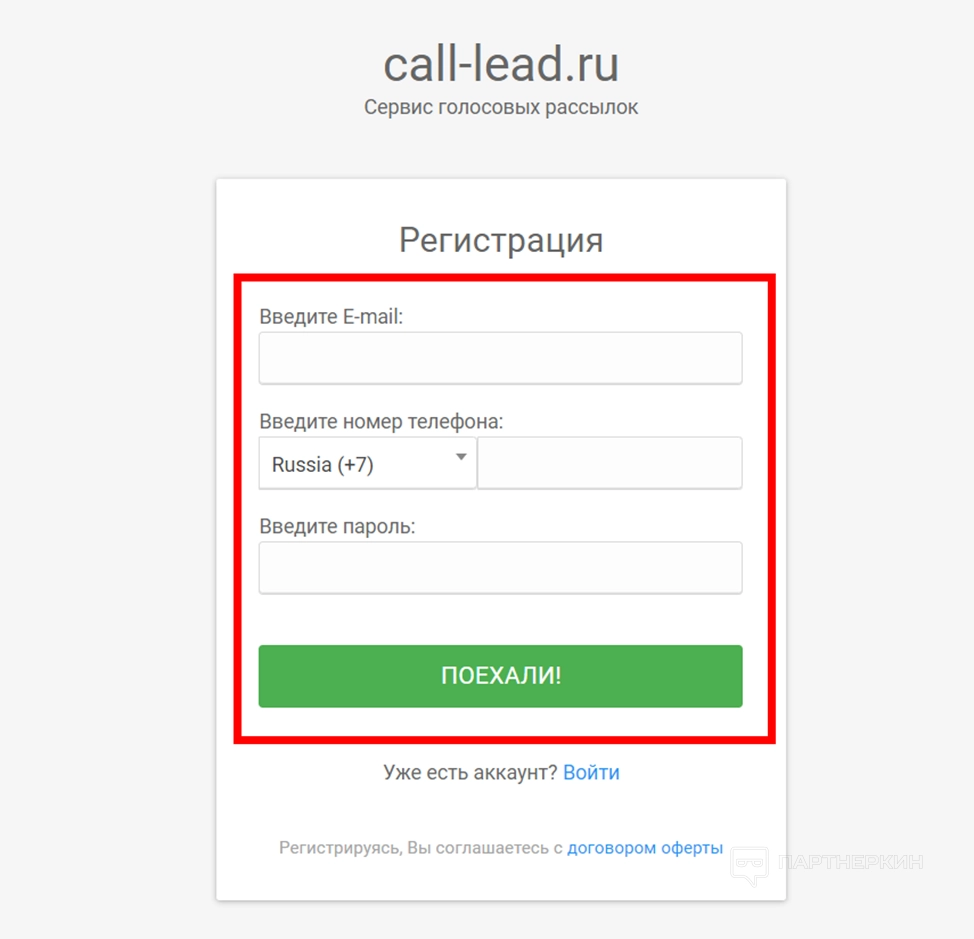 1. Заполните форму: укажите ваш e-mail, номер телефона и придумайте пароль. В конце нажмите на кнопку «Поехали».