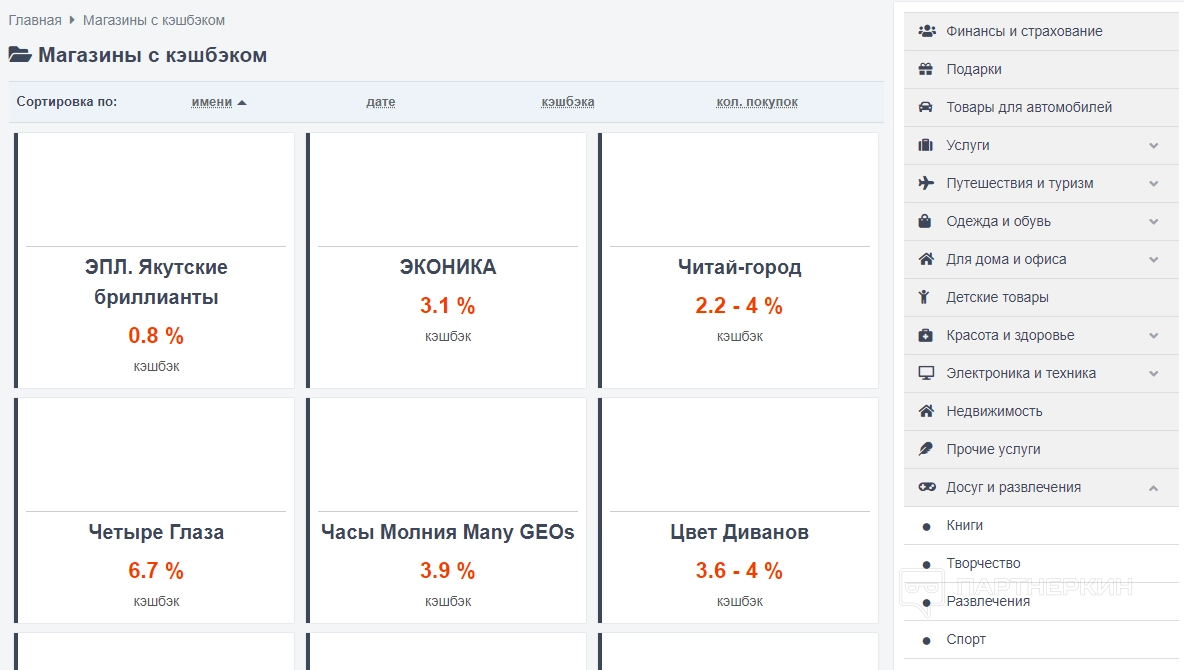 Чтобы подробнее изучить каждый раздел, необходимо выбрать его в правом меню. Затем пользователи увидят список магазинов и ознакомятся с условиями получения кешбэка.