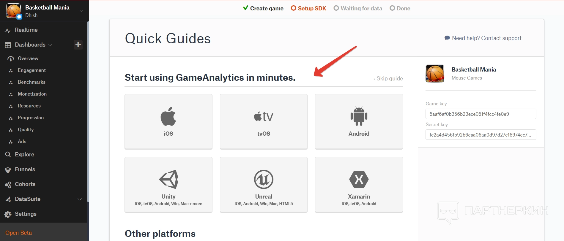 В панели уже показываются основные данные по игре, которые касаются как и маркетологов, так и разработчиков. Например, система может определить ошибки при тестировании игры, а может показать примерные затраты пользователя в день. Чтобы использовать приложение полноценно, лучше его интегрировать с нужной платформой — на сайте есть полноценные гайды с инструкциями по интеграции.