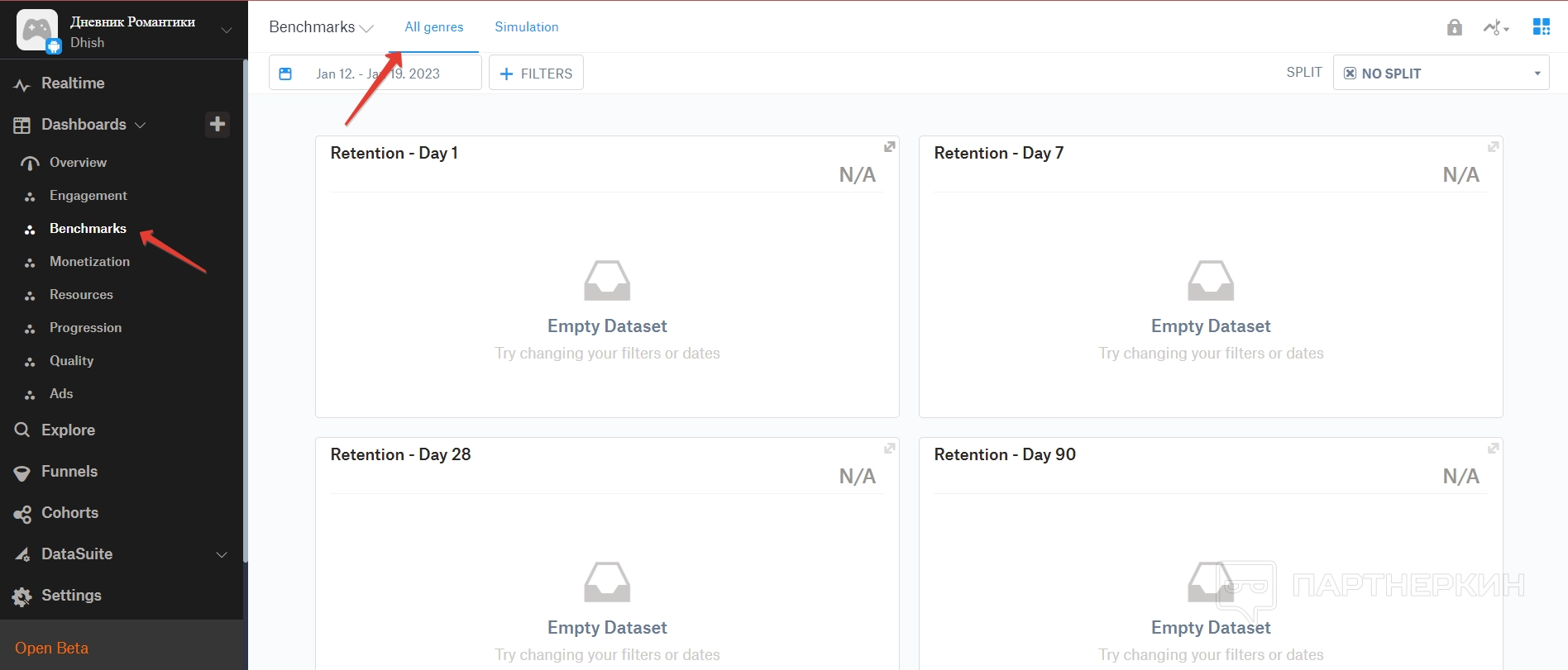 Ориентиры — в этом пункте можно изучить основные показатели по удержанию пользователей, а также их затратам с игре в зависимости от жанра. Для этого есть основной подпункт со всеми жанрами, а также пункты, которые соответствуют жанрам указанной игры.