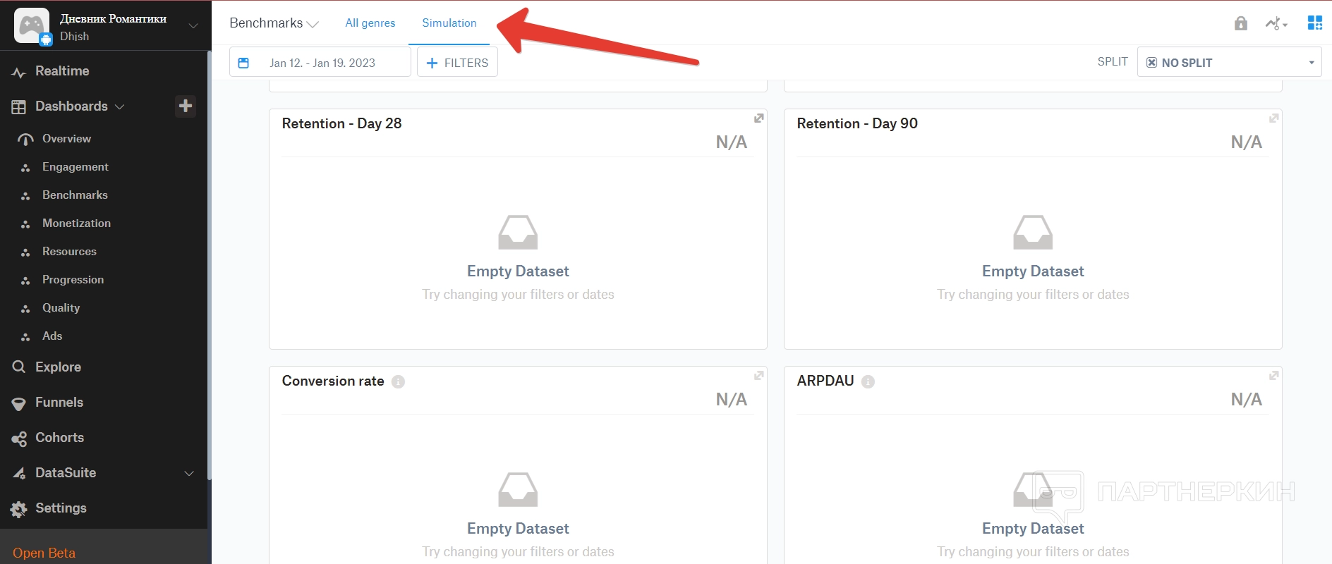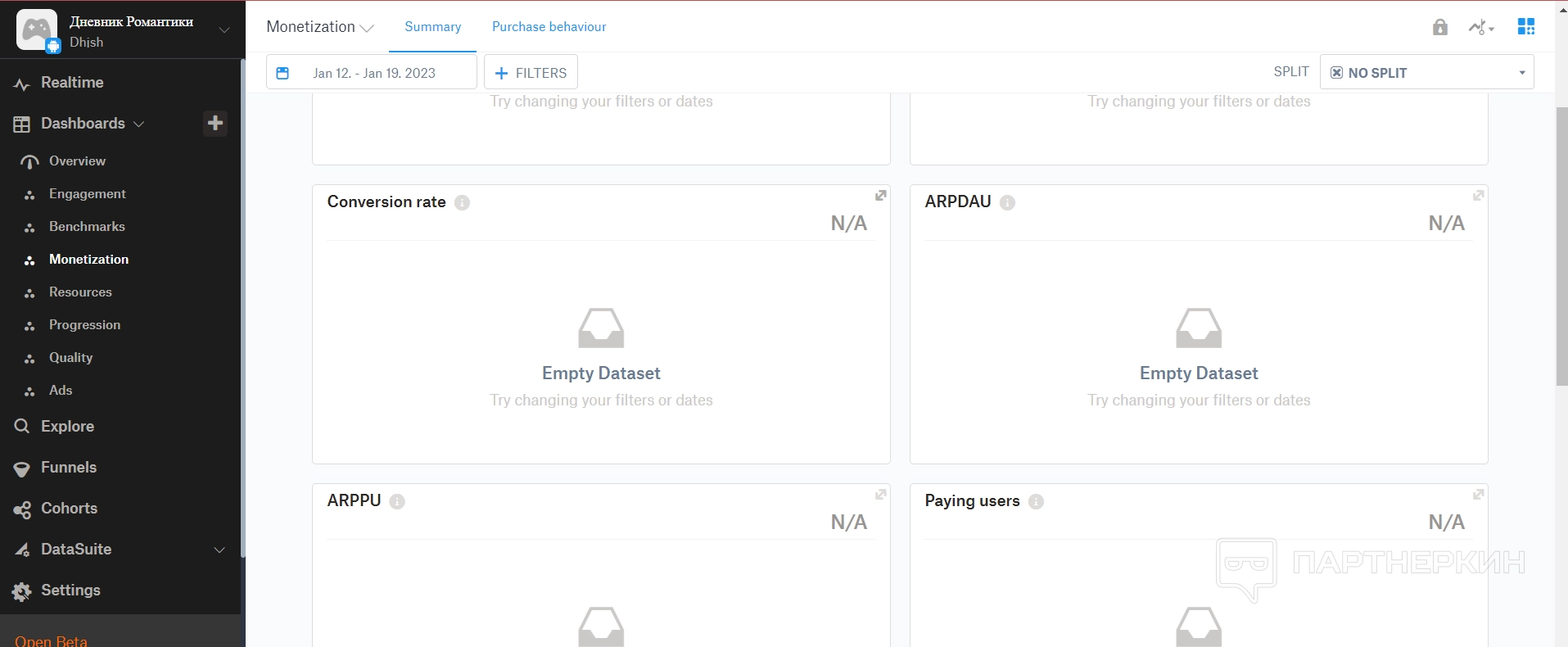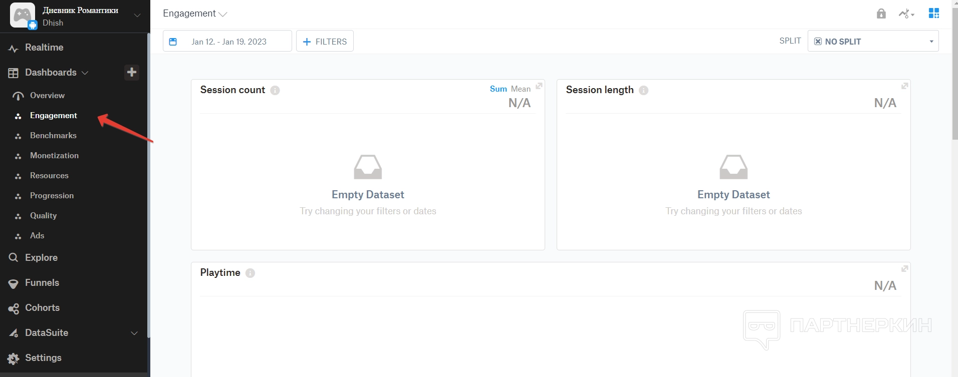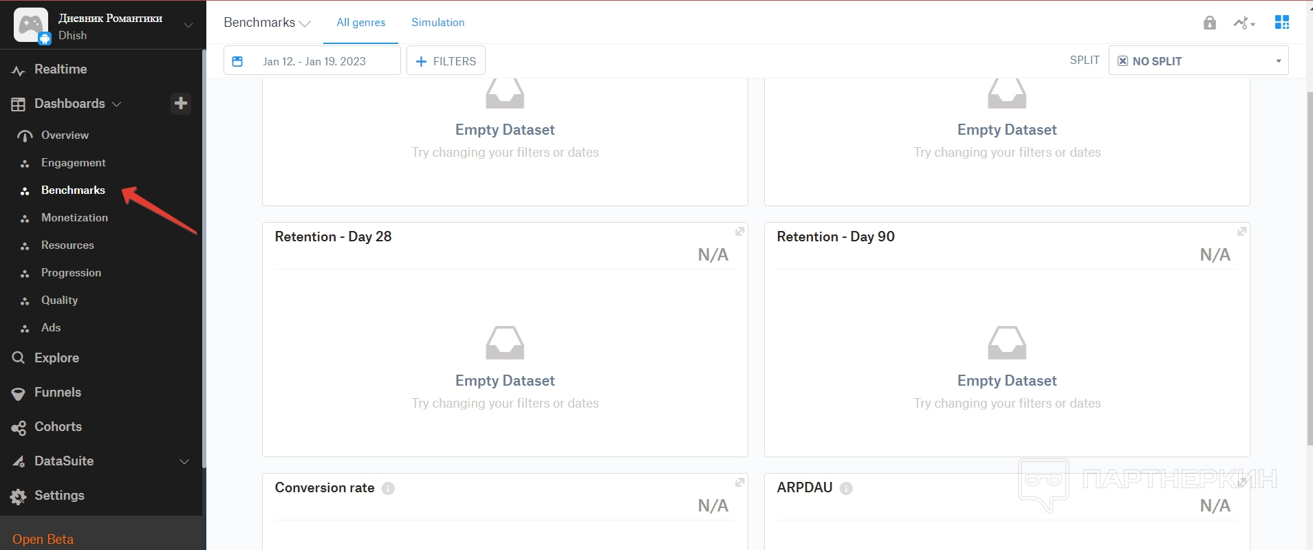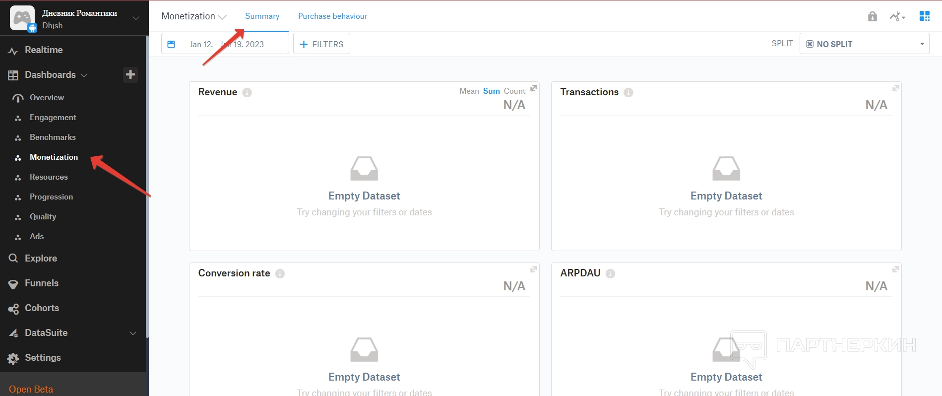Дашборд — это большой раздел, в котором собираются все аналитические данные по игре. Все они разделены на отдельные пункты.