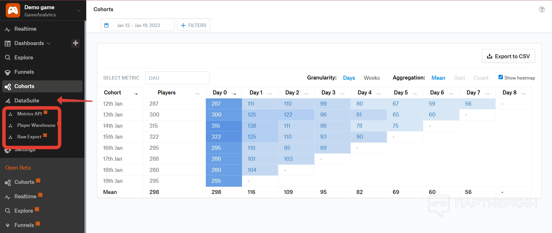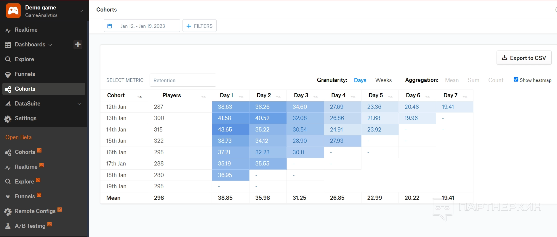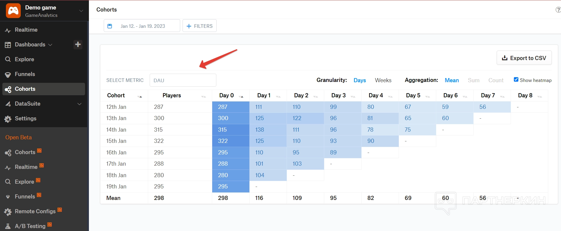 Когорты — в этом разделе можно посмотреть основные показатели по метрикам в виде таблицы за последние неделю или месяц, например. В таблице отобразятся день и дату и количество активных юзеров.