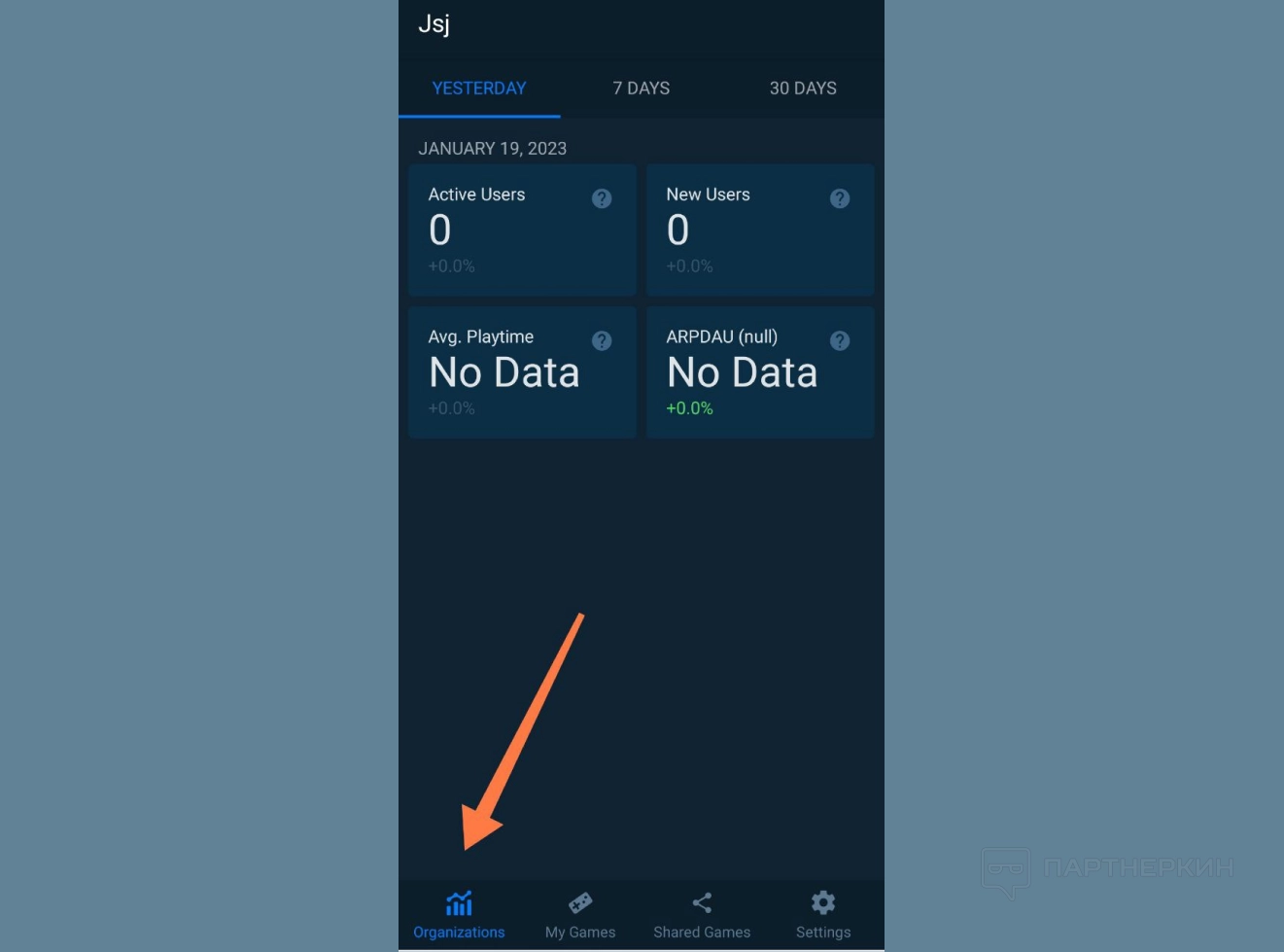Организации — это главный раздел в приложении, в котором можно посмотреть информацию по своей организации и студиях, которые ей принадлежат. Система отображает количество активных юзеров за сутки, количество новых юзеров, а также доход от одного пользователя за сутки и общий доход за день. Для удобства отображаются проценты — они показывают, насколько данные изменились в сравнении с предыдущим днем.