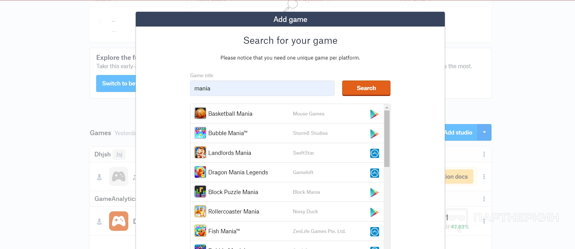 В результатах будут появляться все игры с указанными фразами в названии. Также пользователь может видеть, где именно эти игры расположены — в Google Play или AppStore.