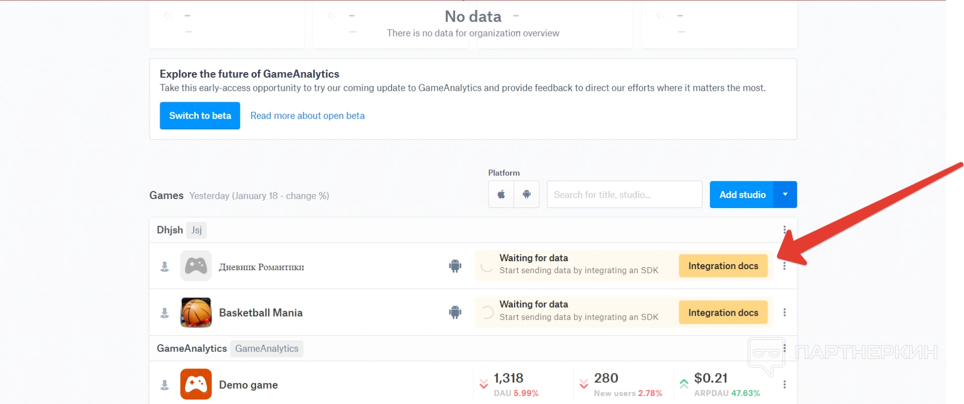 После добавления игры она отобразится в личном кабинете пользователя — можно по ней тапнуть, чтобы перейти в панель аналитики.