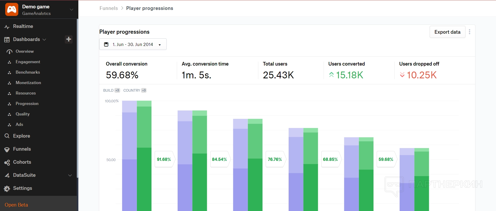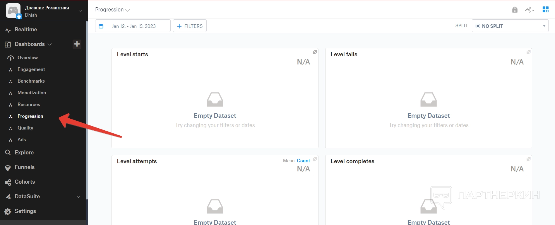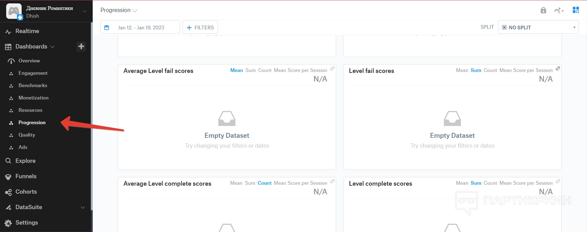 Прогрессия — в этом пункте подбиваются данные по прогрессии игроков в зависимости от их прохождения уровней игры.