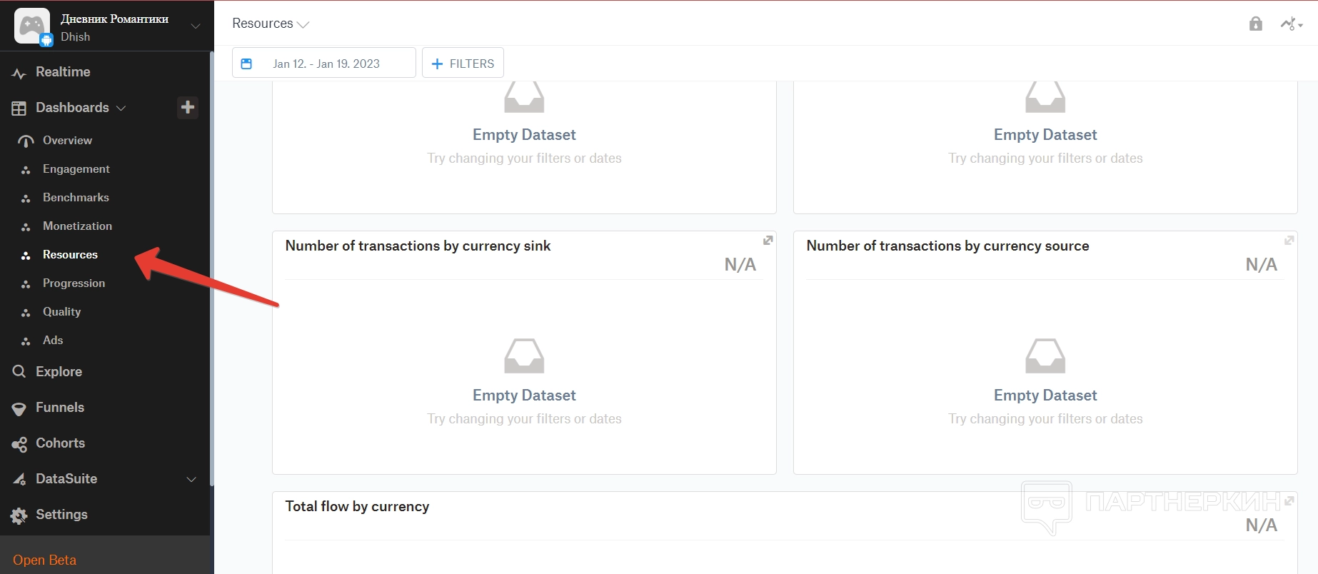 Ресурсы — в этом пункте можно найти основные данные по валютам пользователей. Например, все транзакции внутри игры, а разделены они по типу — в зависимости от того, пополняет ли пользователь счет в игре или выводит средства из игры. То есть показываются все входящие и исходящие транзакции, и это может дать понимание, игроки в игре больше тратят или зарабатывают деньги.