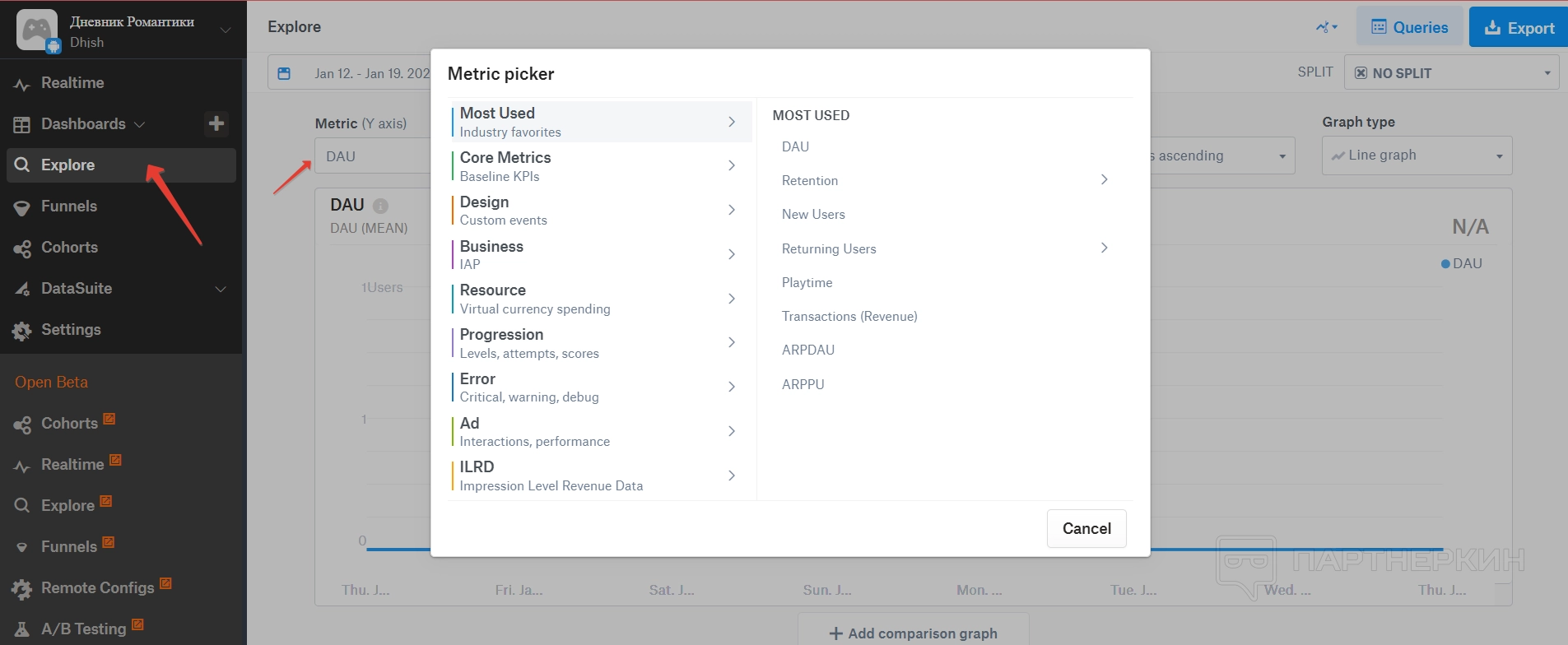 В разделе можно посмотреть базовые метрики, метрики по дизайну в игре, маркетинговые метрики, метрики по ошибкам, ресурсам игры или объявлениям.