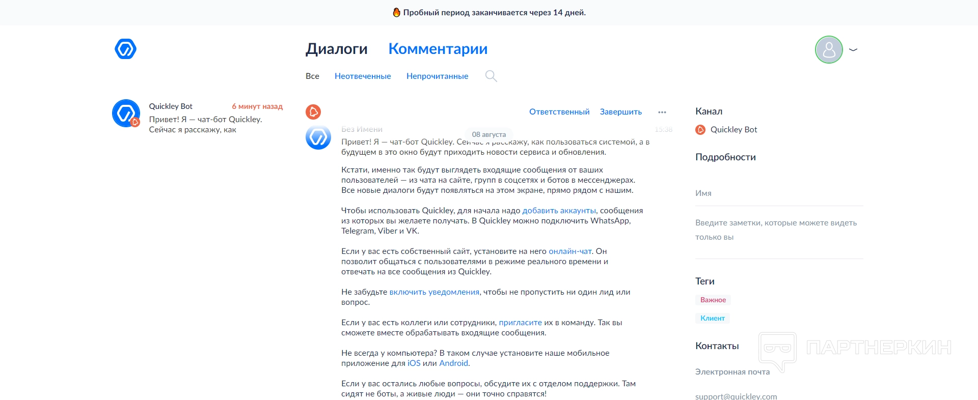 Quickleyпозволяет нескольким сотрудникам работать в одном аккаунте, что упрощает процесс общения с клиентами. Команда может общаться с клиентами, обмениваться заметками и комментариями, а также следить за историей переписки.