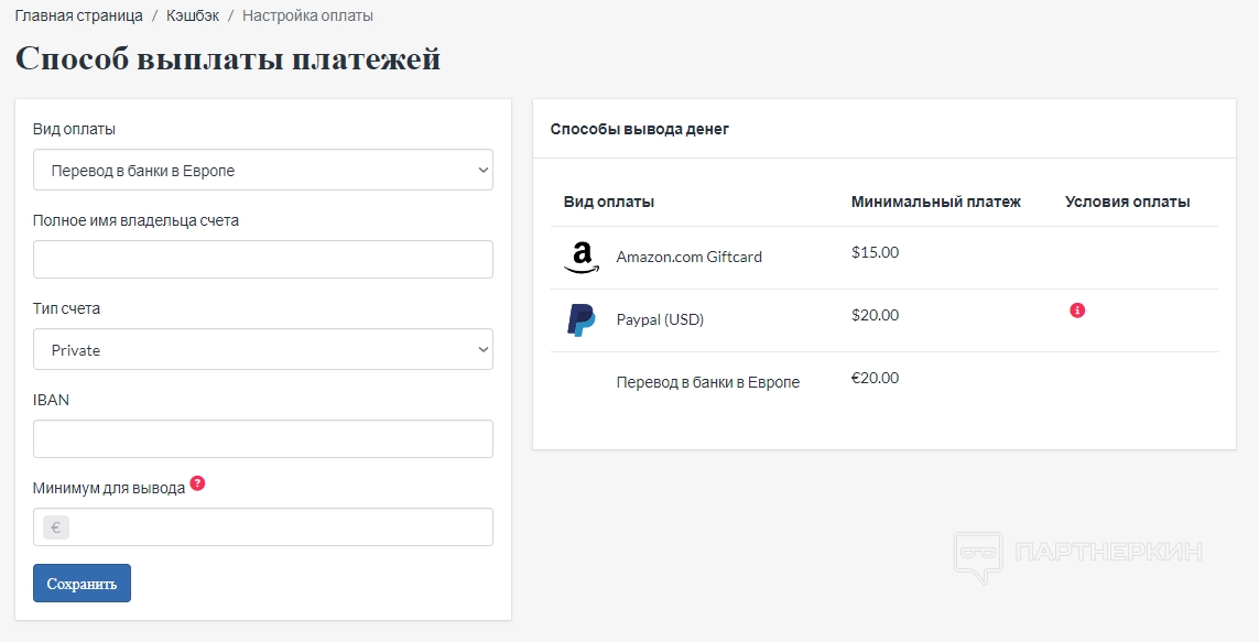 - Перевод в европейские банки. Необходимо указать полное имя владельца счета, тип счета (private, business), IBAN. Минимальный платеж: €20.