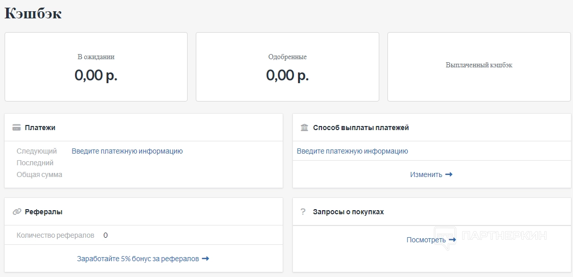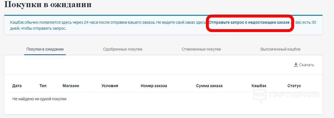 Кешбэк отображается в этом разделе через 24 часа после отправки заказа пользователя. Если бонусные начисления не появляются на странице, необходимо отправить запрос о недостающем заказе.