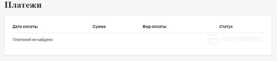 На этой странице отображается список платежей (дата оплаты, сумма, вид оплаты, статус).