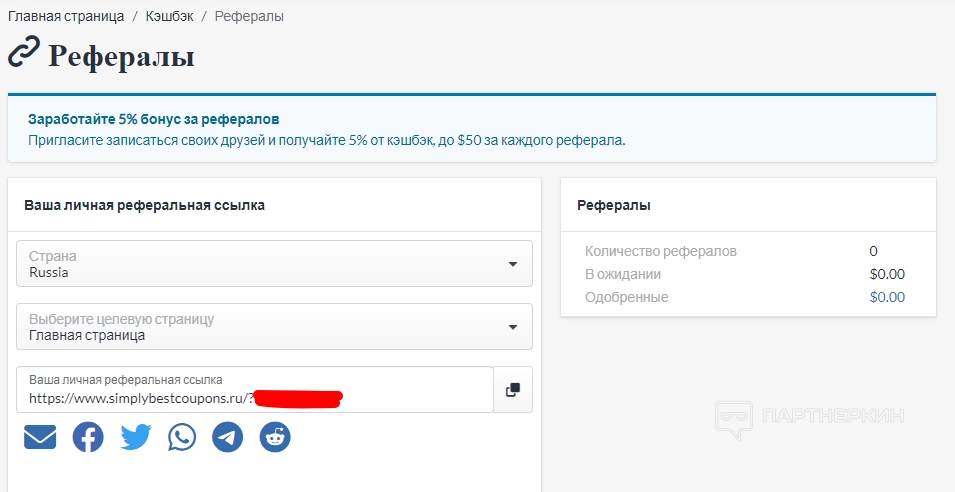 Партнерская ссылка находится в личном кабинете (раздел «Рефералы») и выглядит так:
