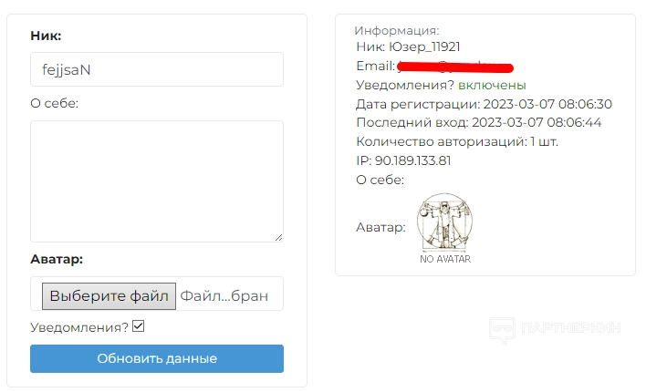 В настройках аккаунта пользователь может установить никнейм, заполнить информацию в графе «О себе», загрузить аватар и включить уведомления. Чтобы данные сохранились, нужно нажать кнопку «Обновить данные».