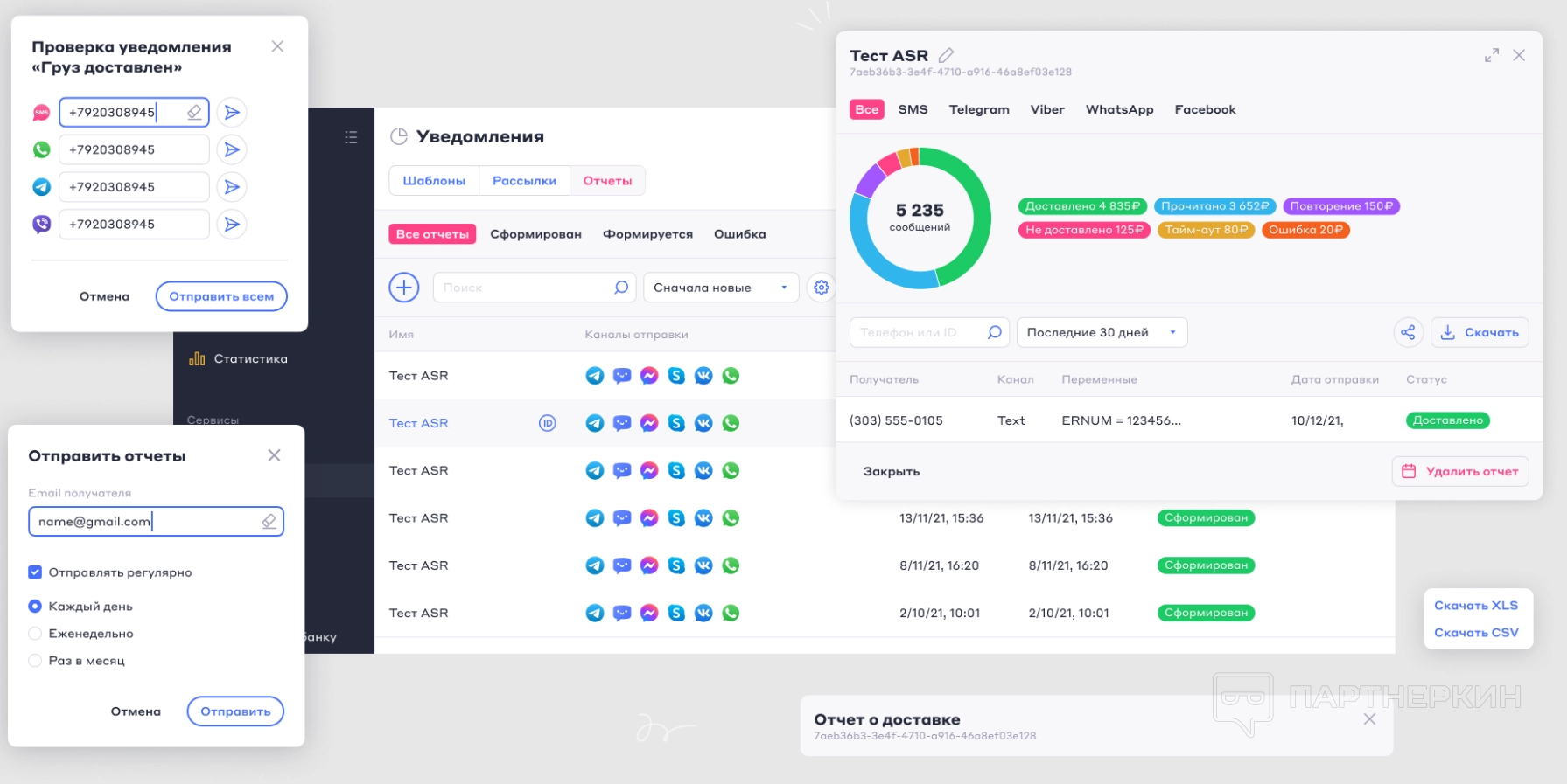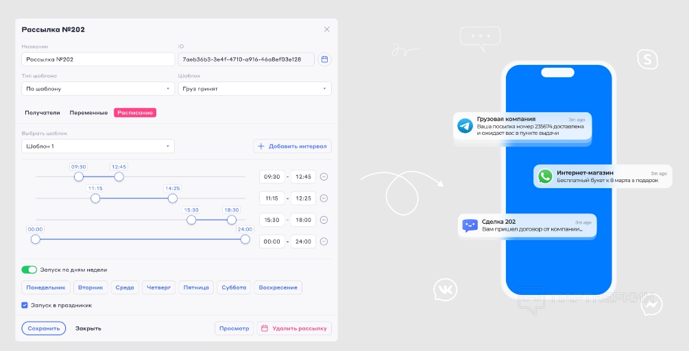 - отправление уведомлений или информационных писем в разные каналы связи: социальные сети, мессенджеры, электронная почта, телефоны клиентов;