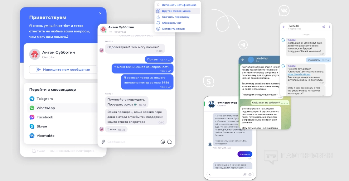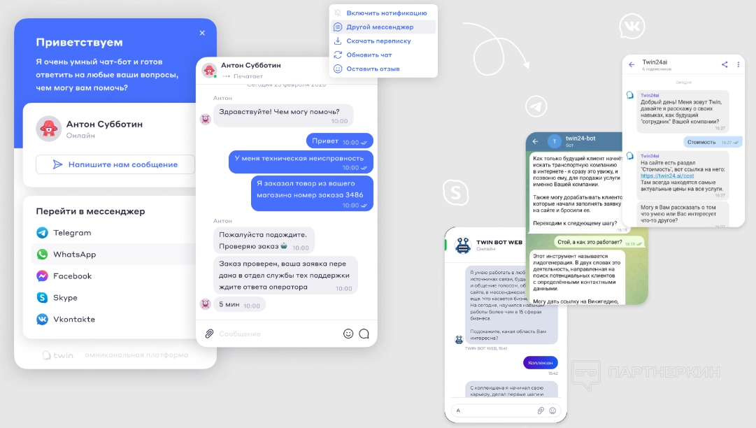 Twin-боты ведут переписку с клиентами, используют в работе гибкие сценарии, отправляют документы и фотографии — максимально удобное решение для бизнеса.