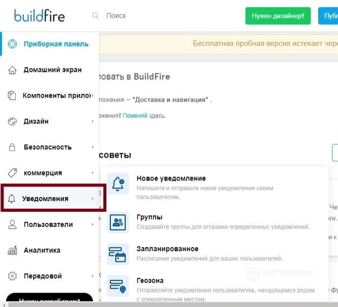 Раздел уведомления отвечает за настройку различных оповещений, планирование отправки определенных сообщений будущим пользователям и так далее.