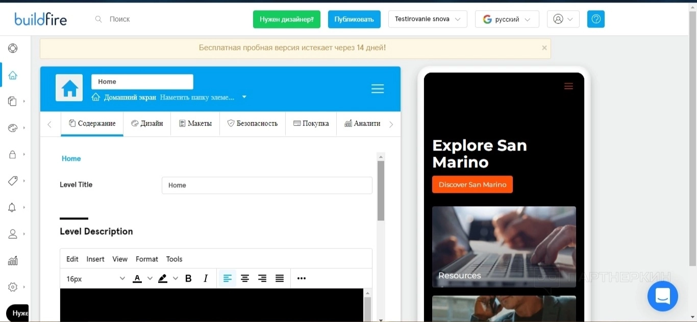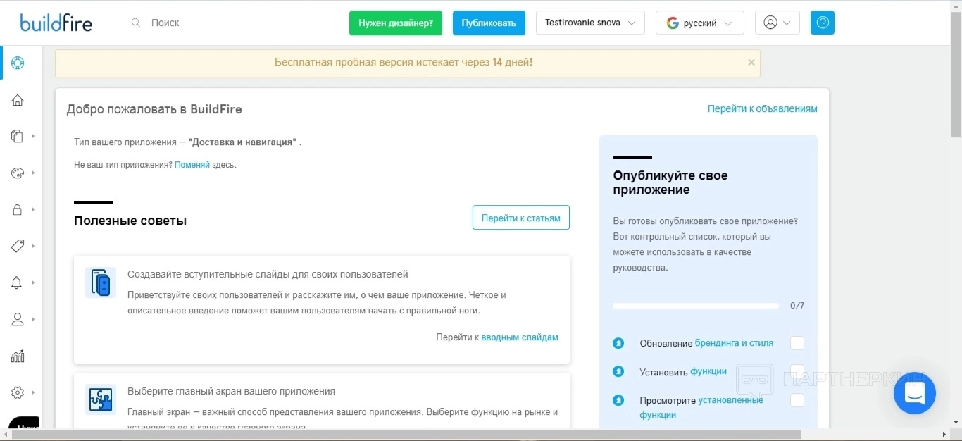 Как только приложение полностью настроено и в специальном меню с подсказками стоят все галочки — его можно публиковать. Для этого нажимаем на соответствующую кнопку, покупаем необходимую подписку (годовую или месячную) и приложение публикуется на выбранные платформы. Без оплаты премиум доступа приложение так и останется в качестве черновой разработки.