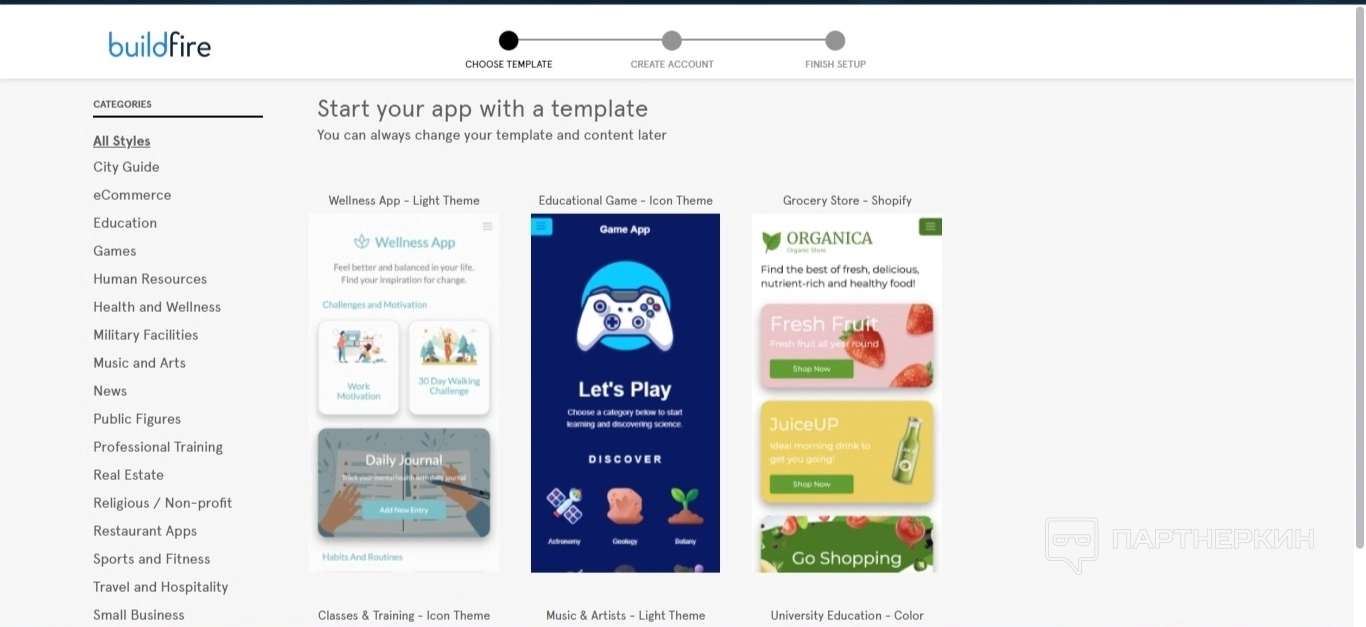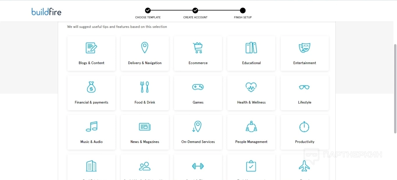 Далее открывается окно с выбором чернового макета будущего приложения. Все выбранные настройки на этом и последующих этапах до момента регистрации можно будет изменить в личном кабинете.