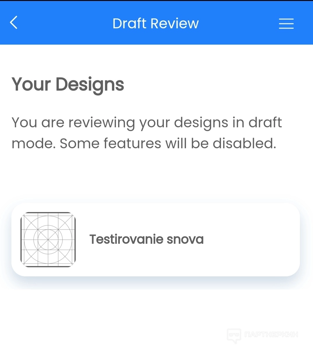 Чтобы получить доступ к просмотру созданных приложений необходимо сначала войти в свою учетную запись. После чего в специальном разделе (кнопка посередине экрана внизу) откроет доступ к черновикам. Создатели предупреждают, что в приложении возможен только просмотр будущего проекта, остальные функции отключены (редактирование недоступно).