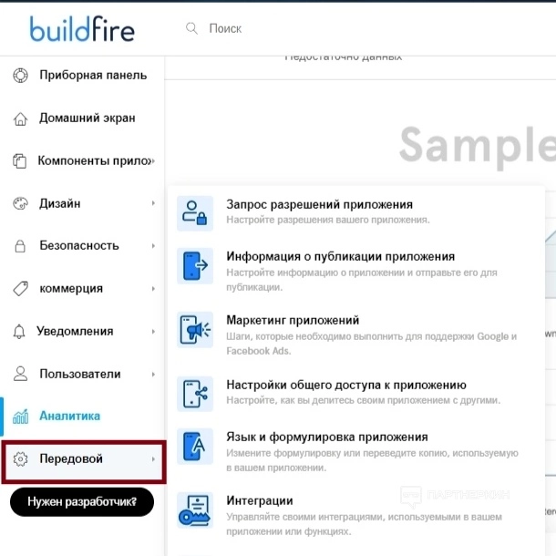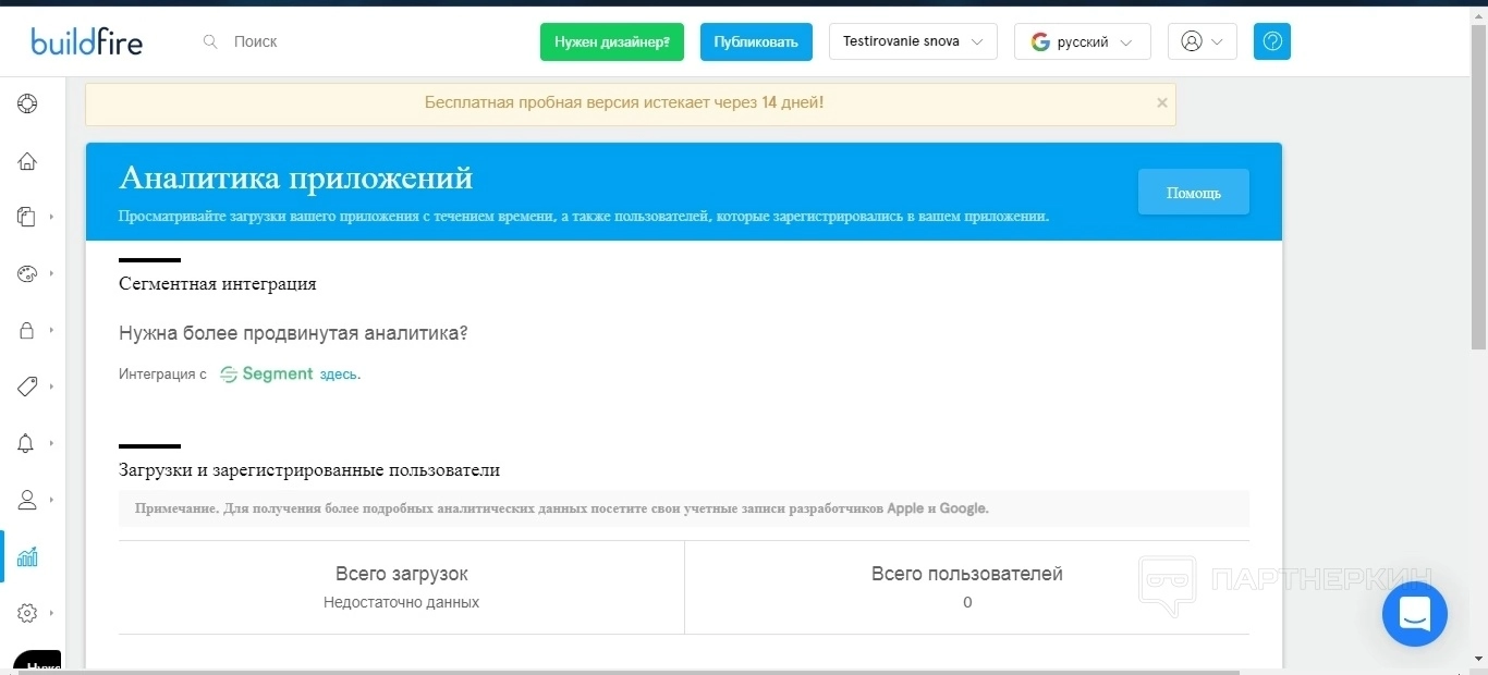 Раздел аналитики будет в будущем показывать статистику по опубликованному приложению.