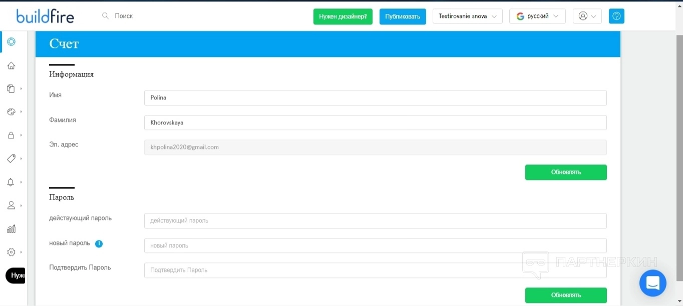Нажимая на значок своего аватара, пользователь может настроить некоторые данные в личном кабинете (имя, почту и пароль).