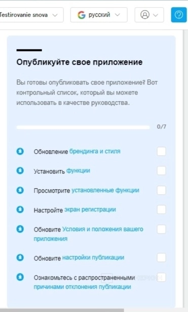 Чтобы приложение можно было опубликовать, справа есть специальный список необходимых настроек, которые должны быть воплощены, иначе приложение нельзя будет опубликовать.