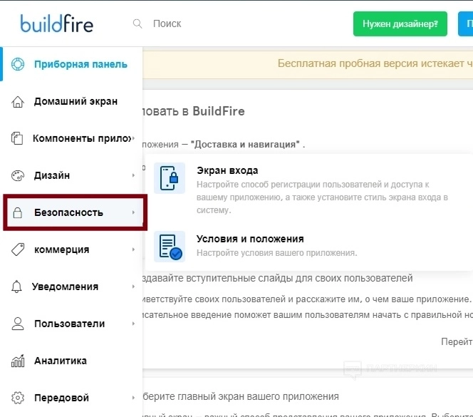 В безопасности настраивается доступ в приложение (каким образом будет проходить авторизация в нем) и местная политика конфиденциальности и условия пользования.