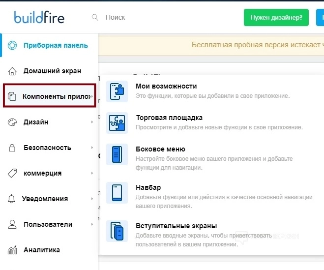 Следующий этап — компоненты приложения. Здесь настраиваются остальные экраны, боковое меню, функции внутри приложения и так далее.