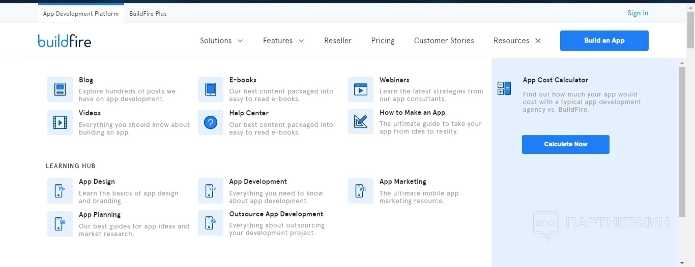 Последний раздел отвечает за предоставление новичкам и не очень полезных материалов по разным этапам работы с конструктором. Здесь можно посмотреть обучающие видеоролики, почитать блог и электронные книги, написать в центр поддержки и многое другое. Также тут можно рассчитать стоимость создания мобильного приложения на данном сайте, сравнив конечную сумму с конкурентами.